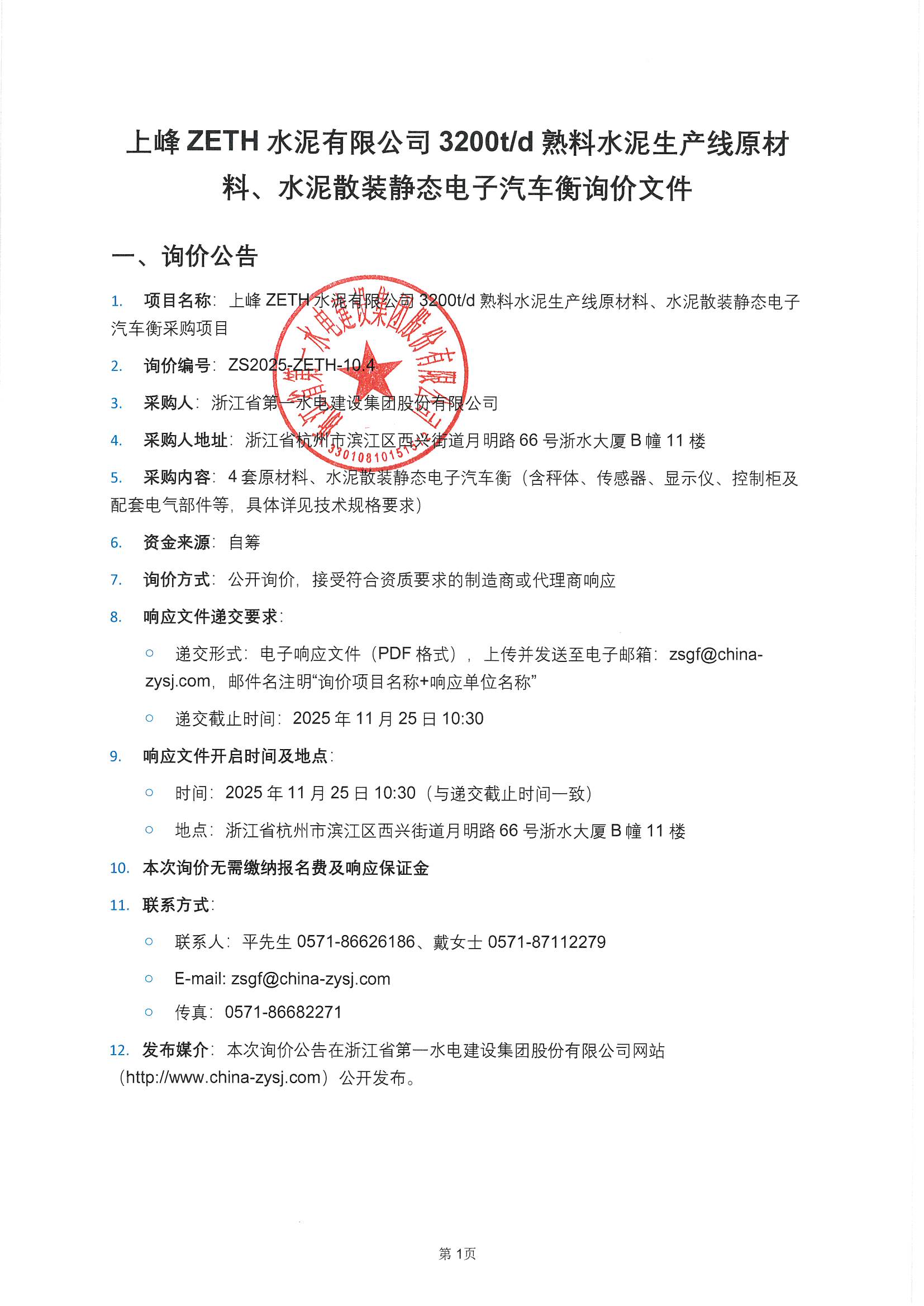 上峰ZETH水泥有限公司3200t/d熟料水泥生產(chǎn)線原材料、水泥散裝靜態(tài)電子汽車衡詢價公告